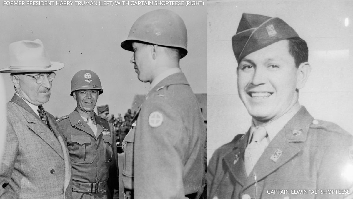 Elwin Shopteese was born in Mayetta on July 16, 1921, and was a member of the Prairie Band Potawatomi Nation. Upon high school graduation, he immediately enlisted in the Kansas National Guard and became a member of Company E, 137th Infantry Regiment. Shopteese and his company were involved in several battles across Europe during World War II, including the invasion of Normandy and the Battle of the Bulge. He received a battlefield commission for his leadership while in combat at Omaha Beach. Shopteese earned a Bronze Star and a Purple Heart for his service during World War II and returned to Kansas to attend Haskell University in 1946 before his service in the Korean War.