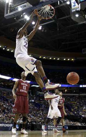Kansas went back inside out of the timeout, dumping the ball to a big man or driving to the basket. The Jayhawks regained the lead at 59-56 on Wayne Selden's free throw and Traylor's putback dunk, and then kept turning back every 3-pointer that Eastern Kentucky managed to rattle home.