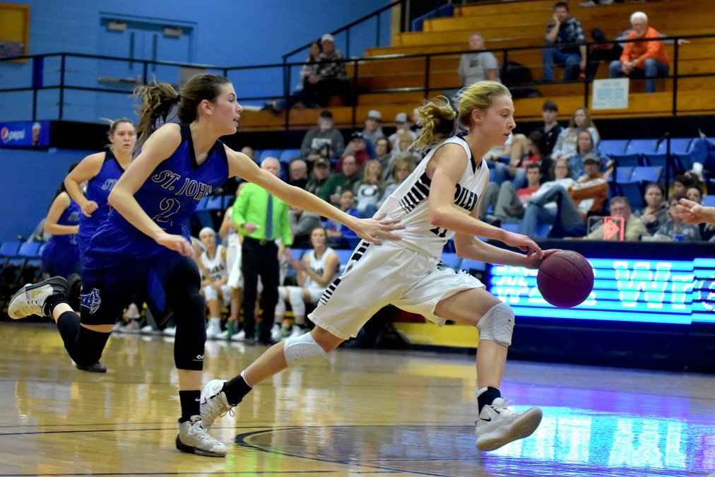Central Plains High School’s Emily Ryan gets past St. John Darby Smith and scores with a layup Friday night during the Barton Hilltop Classic championship game.