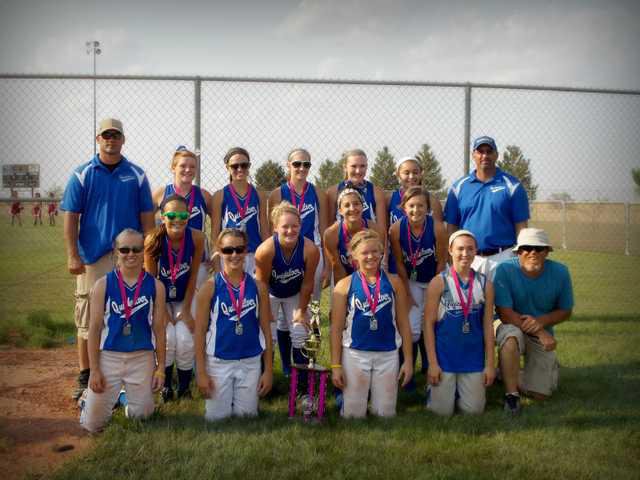 The 16-and-under Quicksilver softball team finished second at a tournament in Dodge City over the weekend, scoring 30 runs in five games. Back row from left, coach Korey Burkhart, Jaycee Kizzar, Peyton Burkhart, Blake Wilt, Macy Moyers, Emma Cape and assistant coach John Wilt. Middle row, Carly Schuette, Taylor Mohr, Regan Unruh and Chandra Gray. Front row, Lindsey Heskamp, Kacee Kasselman, Hannah Mauler, Karisa Schremmer and assistant coach Tom Kizzar. Not pictured, Brook Johnson.