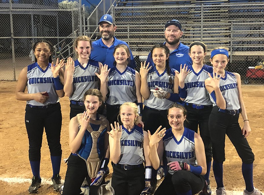 The Great Bend 12-and-under Quicksilver softball team placed first at the Battle for the Rings Tournament April 7 with a 5-0 record. Team members include front row—Lauryn Davis, Halle Post, Kenzie Premer; second row—DeShawnna Bryant, Paige Thexton, Callie Steffan, Natalie Bujanda, Myra Kurth, Rylee Prilling; back row—coaches Khris Thexton, Josh Post.