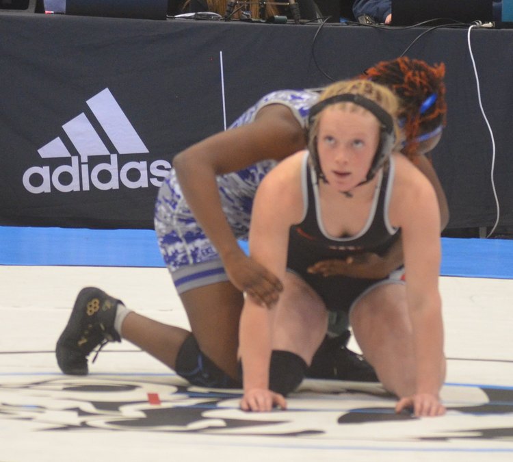 No. 5 ranked Keira Leyva lost to St. Thomas Aquinas; Keila Cisper 6-4 to place sixth. Kapaun Mt. Carmel's state champion Hailey Estrada pinned Leyva (1:43).